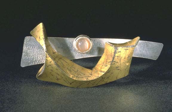 Pin, Swoop Series, moonstone, 24k, 18k doublee, sterling, scored