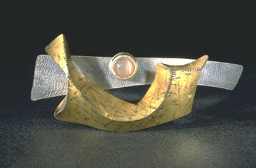 and bent), sterling, 24k gold, moonstone, 8 cm wide, 1990, $2,400